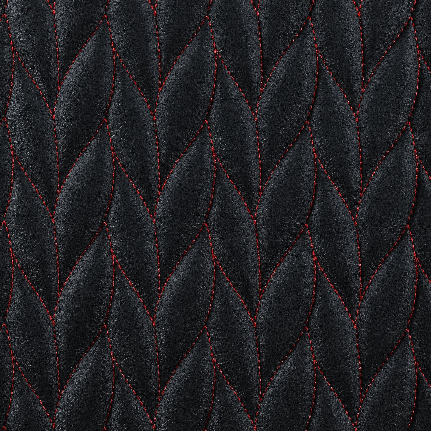 • Contemporary office chair wrapped in black leatherette with botanical-inspired herringbone pattern and red stitching details for a bold statement piece