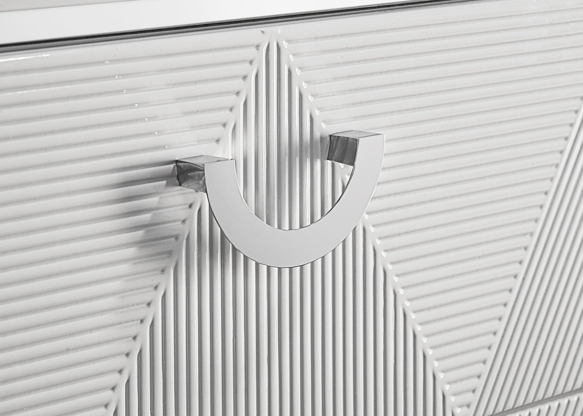 • White high gloss bedroom set with sculpted drawer fronts and chevron-tufted LED headboard