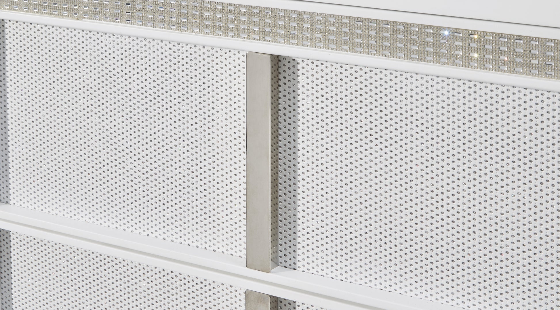 Details | Includes queen upholstered headboard, storage footboard, rails and roll slats, Made with solid wood components, MDF substrate and decorative laminate, White lacquer finish, Vertical metal drawer pulls, Faux leather upholstery, Built-in LED lighting with 3-way dimmer switch, 2 drawers with fully finished interior, dovetail construction and ball-bearing side glides, Drawers with rhinestone frames; textured laminate drawer fronts, Power cord included; UL Listed, Bed does not require additional foundation/box spring; accommodates most zero clearance adjustable bases with the addition of a bunkie board, Mattress available, sold separately, Assembly required | |