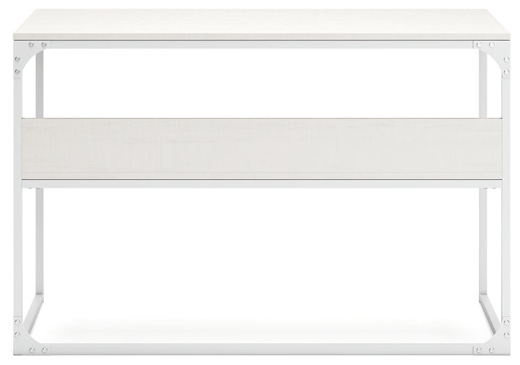 Details | Made with engineered wood and melamine laminate, Replicated pickled white oak wood grain, MEGA-TUFF® melamine surfaces are made of easy-clean melamine which is heat-, scratch-, water- and stain-resistant, Tubular metal frame with white powder coated finish, 1 shelf along back side, Assembly required | |