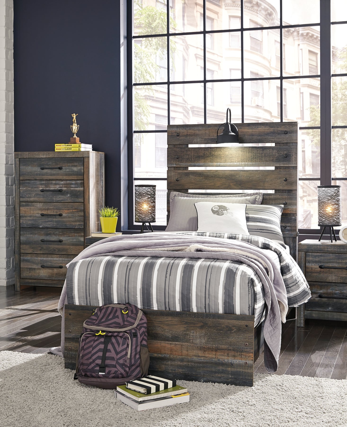 Details | Includes headboard, footboard and rails, Made of engineered wood (MDF/particleboard) and decorative laminate, Brown rustic finish with burnt orange and teal accents in a replicated wood grain with authentic touch, 2 decorative sconce LED lights, each runs on 3AA batteries, 2 USB charging ports, Power cord included; UL Listed, Foundation/box spring required, sold separately, Mattress available, sold separately, Assembly required, Bed is compatible with an adjustable base | |