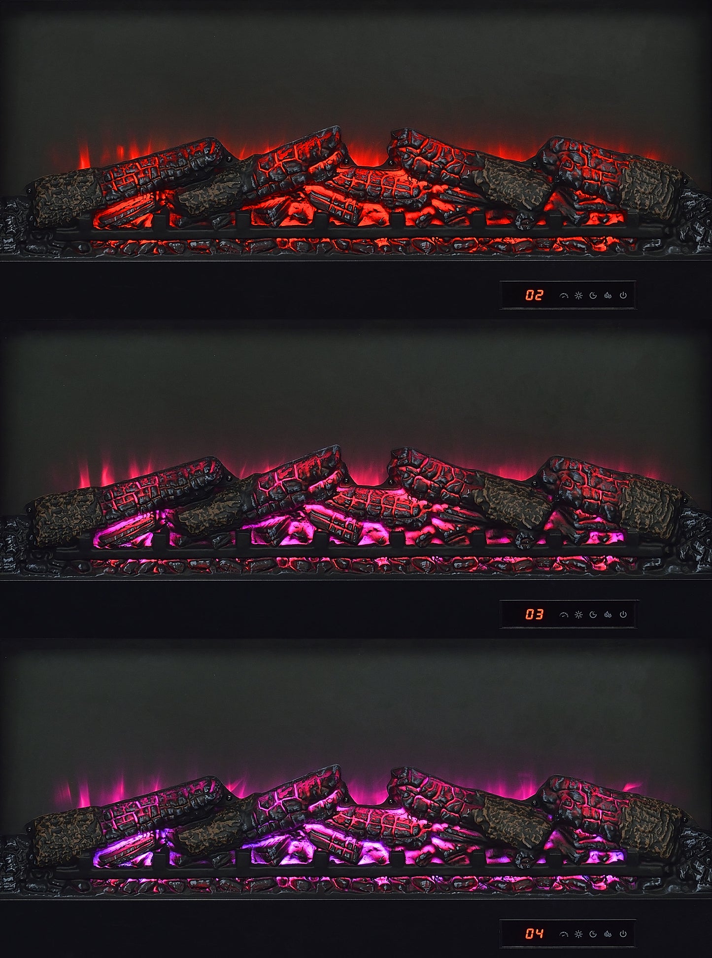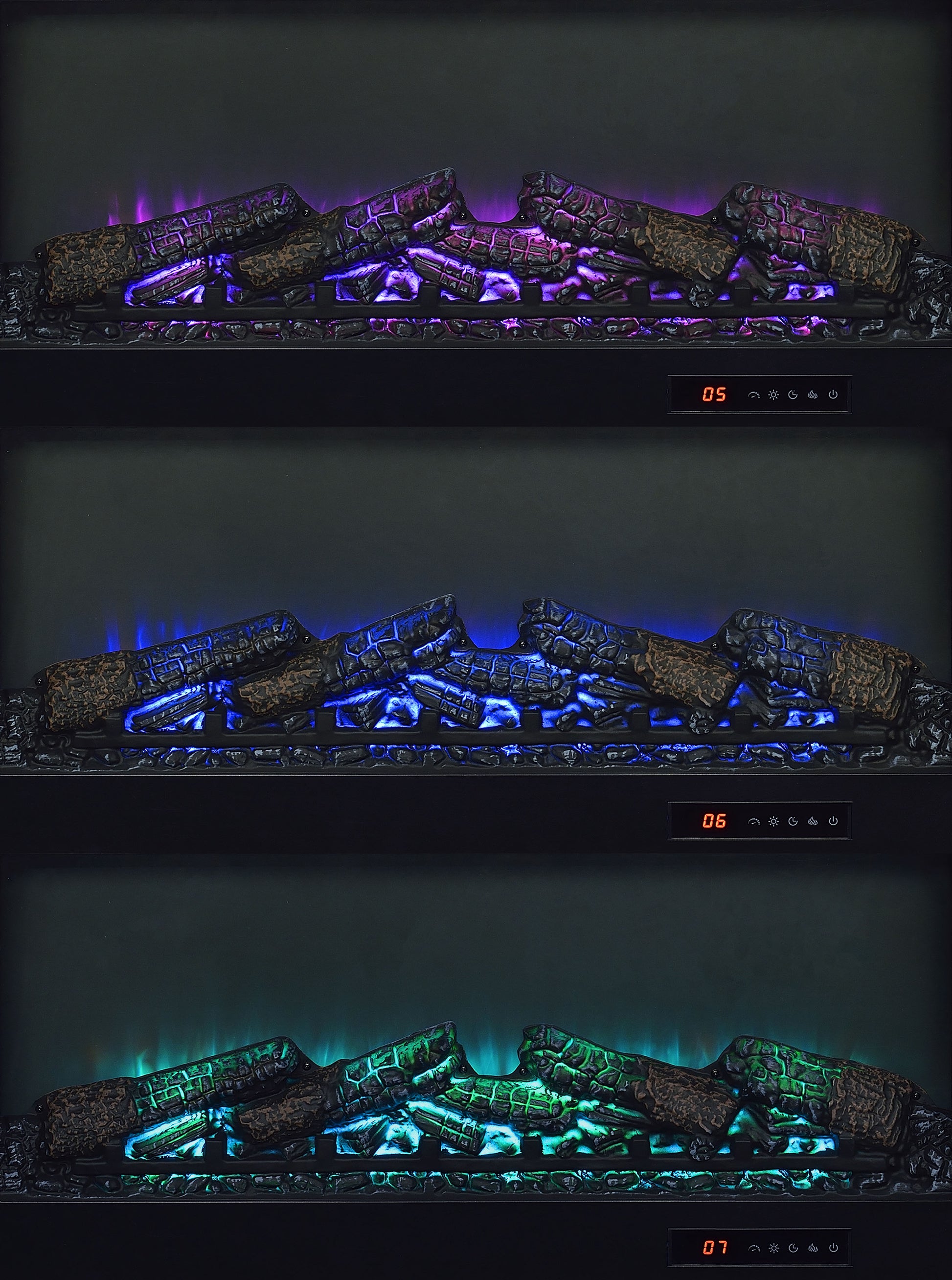 • Center fireplace insert without heat function and glowing ember display for cozy ambiance