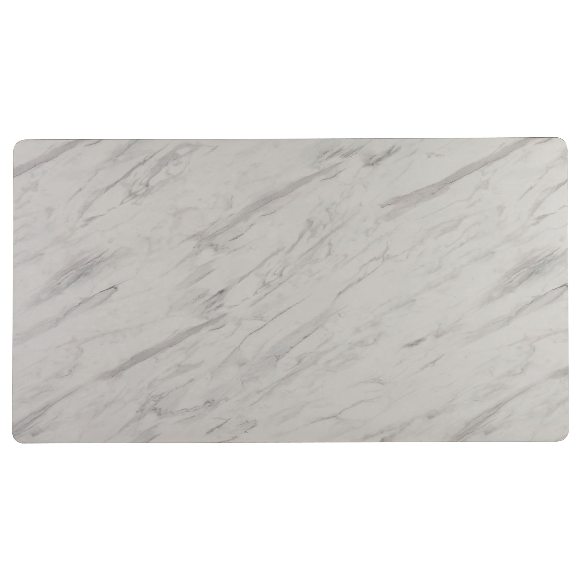 • Faux marble rectangular tabletop and natural walnut finish wood legs create a festive mix of Euro style and Mid-Century Modern Americana for an upgraded casual dining space