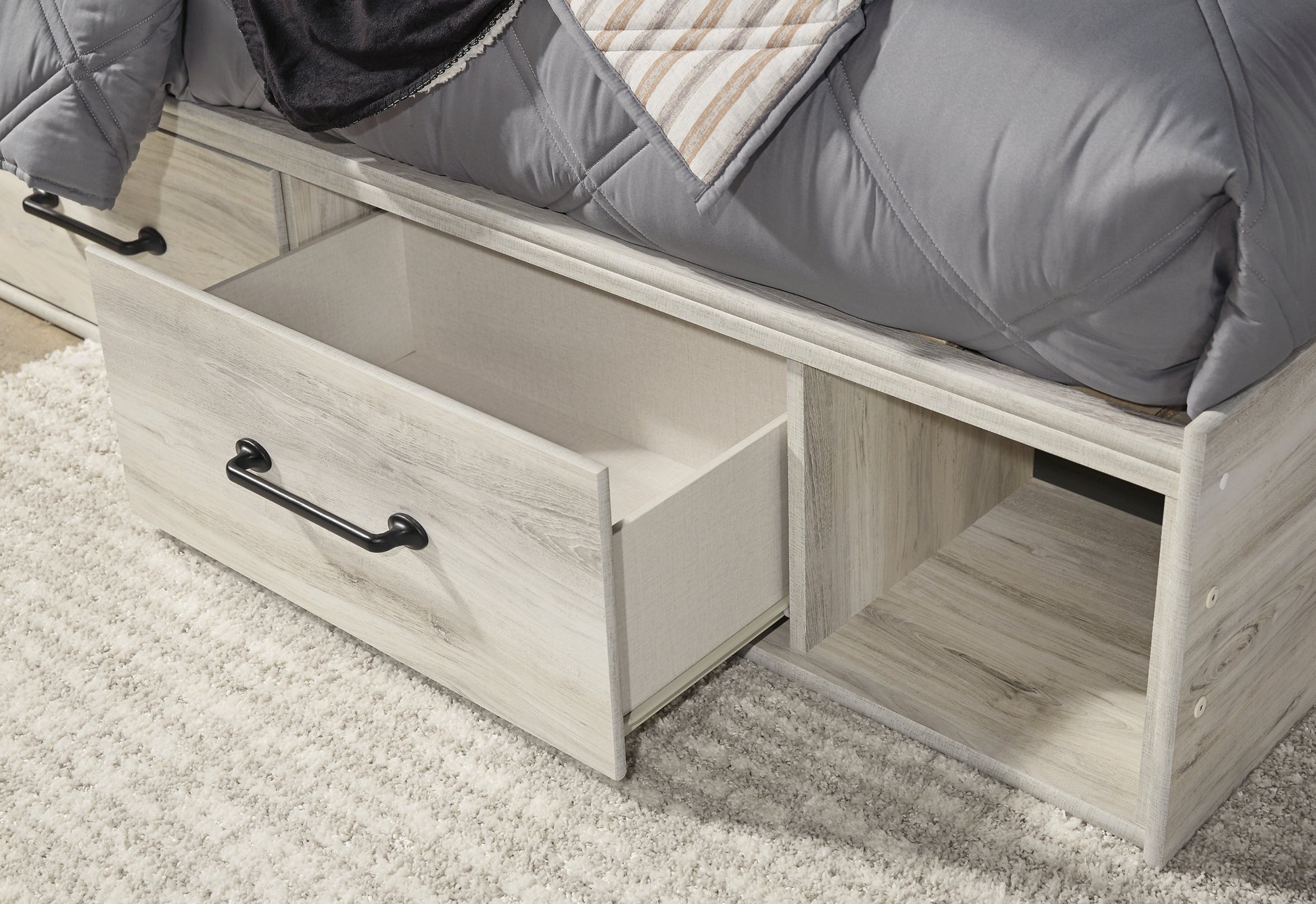 Details | B192B1: Includes dresser with mirror, Made of engineered wood (MDF/particleboard) and decorative laminate, Wispy white finish over replicated oak grain with authentic touch, 6 smooth-gliding drawers, Drawer interiors are lined with a faux linen laminate for a clean, finished look, Large-scale hardware with dark finish, Mirror attaches to back of dresser, Assembly required, B192B34: Includes headboard, footboard, side storage, rails and slats, Made of engineered wood (MDF/particleboard) and decorative laminate, Wispy white finish over replicated oak grain with authentic touch, Large-scale hardware with dark finish, Decorative sconce light, LED with 3 AA batteries, 4 smooth-gliding storage drawers, 4 storage cubbies, 2 slim-profile USB charging ports, Power cord included; UL-listed, Bed does not require additional foundation/box spring; accommodates most zero clearance adjustable bases with the addition of a bunkie board, Mattress available, sold separately, Assembly required, | |