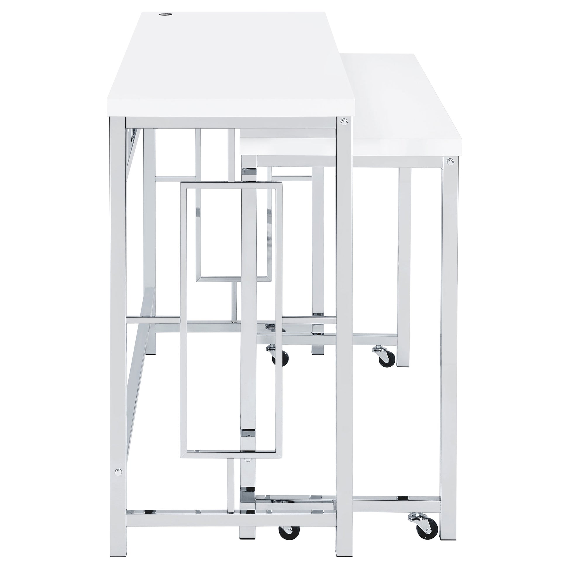 • Smaller table is on wheels and nests under the larger, which includes a USB port in the tabletop