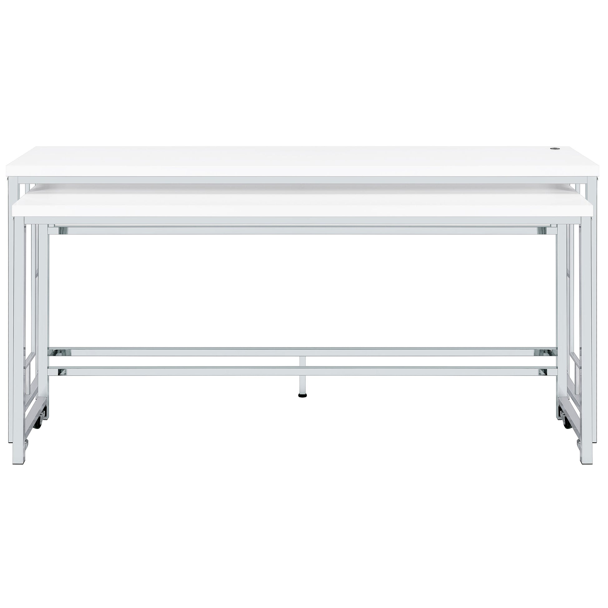 • Smaller table is on wheels and nests under the larger, which includes a USB port in the tabletop