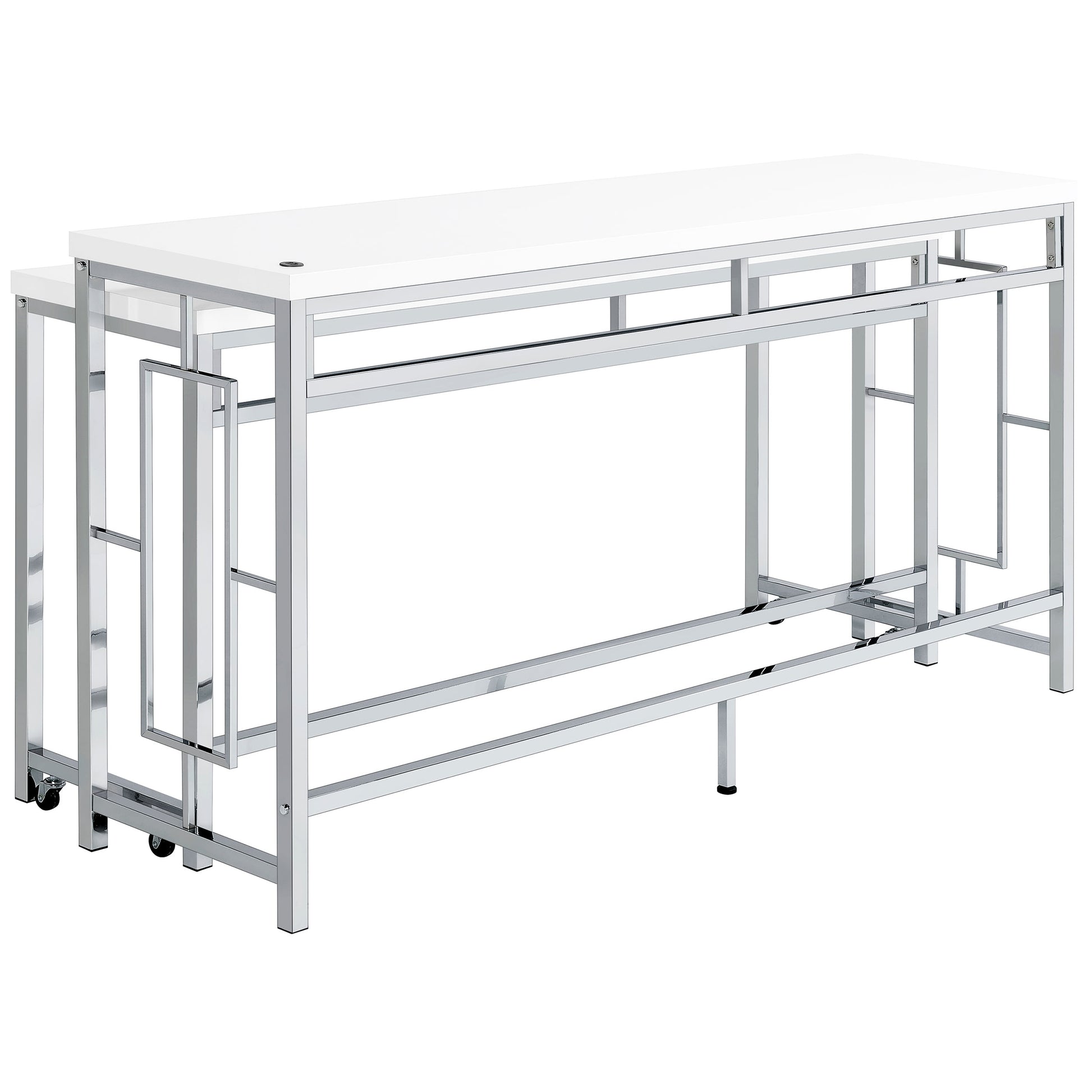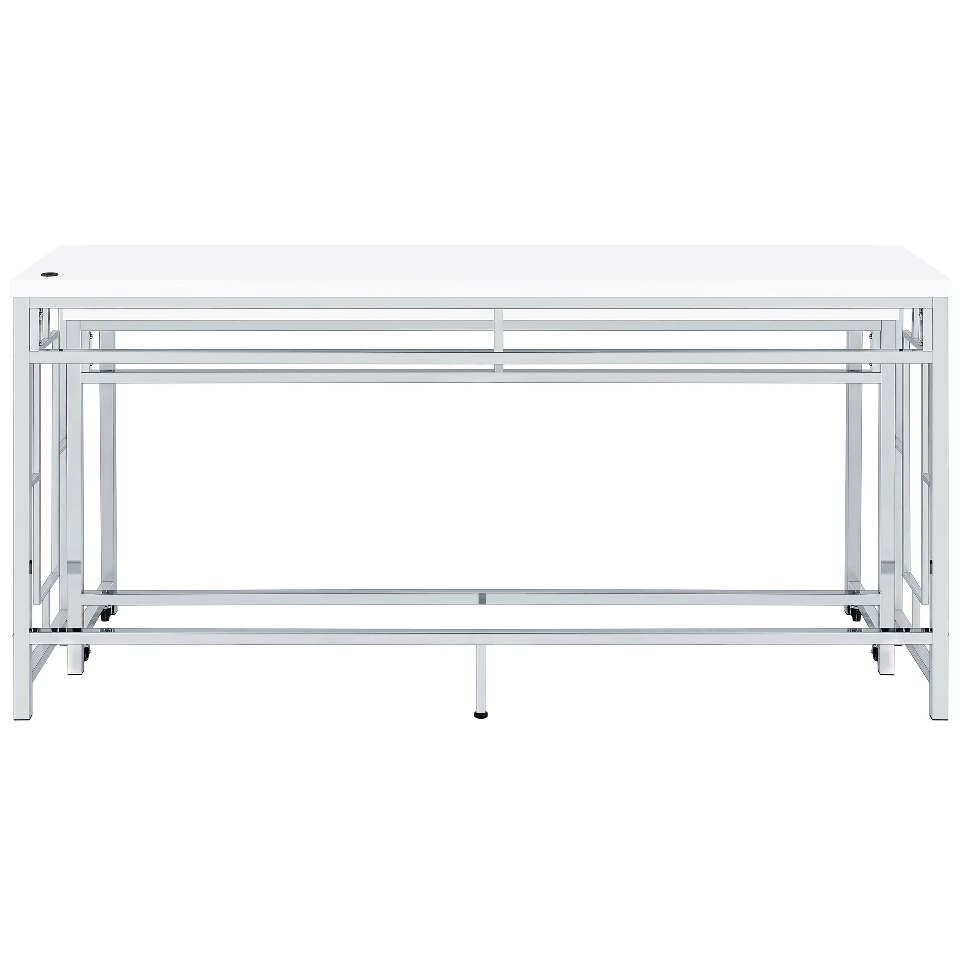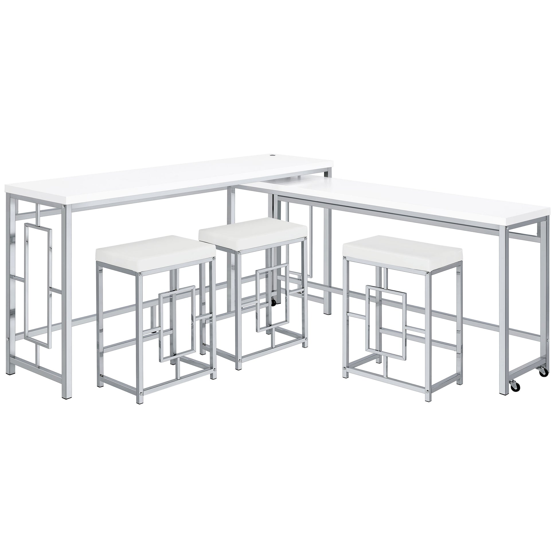 • Silver metal finish perfectly complemented with white tabletops and faux leather for a crisp look