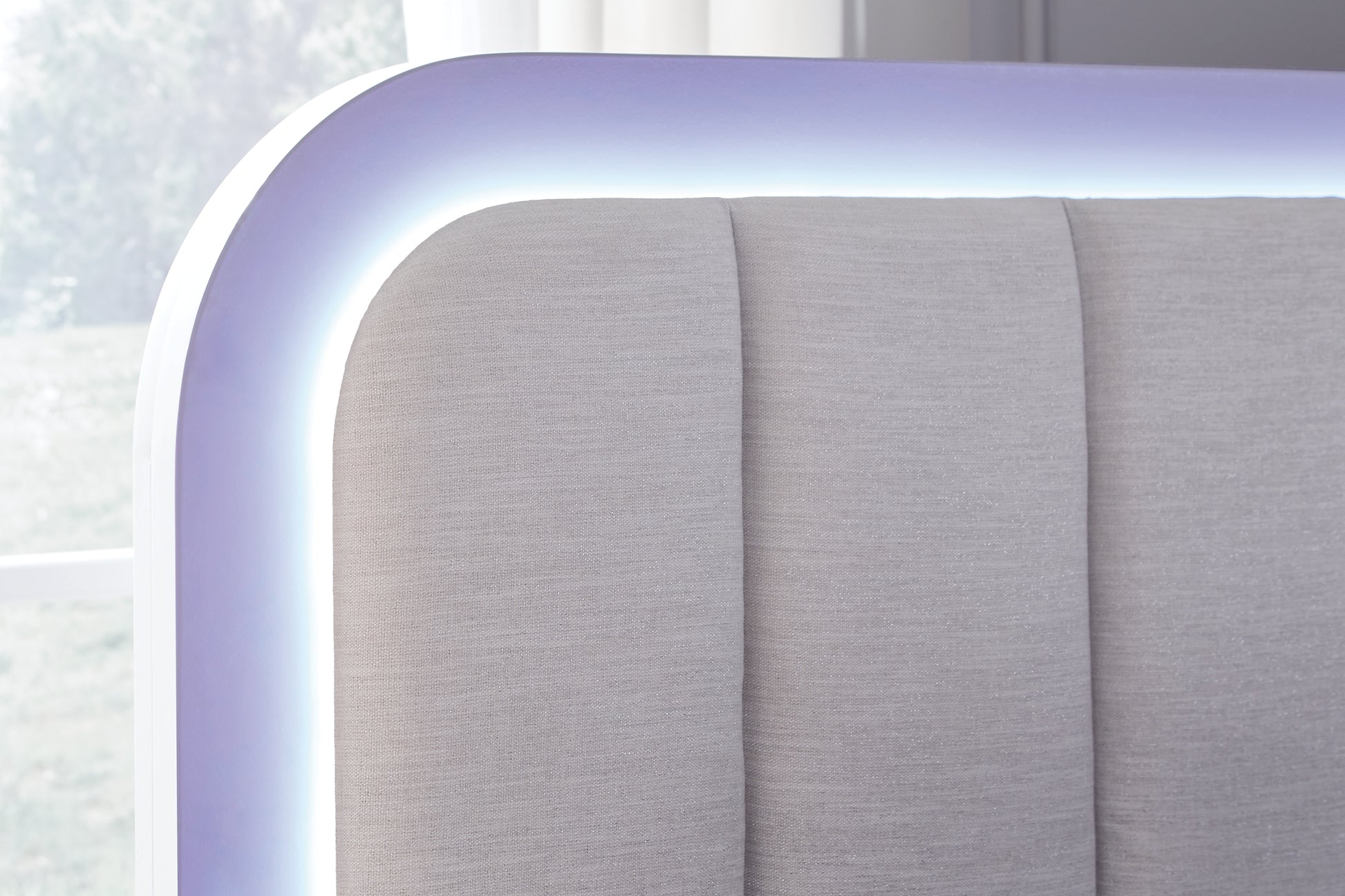 Details | Includes queen upholstered panel headboard, footboard, rails and roll slats, Made with hardwood solids and MDF substrates, Side rails feature laminated solid hardwood slat support rails (or LVL) with glued and screwed blocking for added strength , White paint finish, Polyester upholstery, Built-in LED lighting; 3-way dimmer switch, Power cord included; UL Listed, Bed does not require additional foundation/box spring; accommodates most zero clearance adjustable bases , Mattress available, sold separately, Assembly required | |