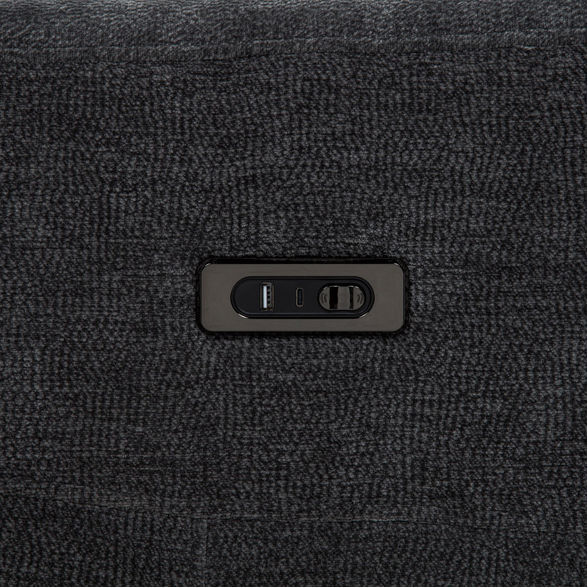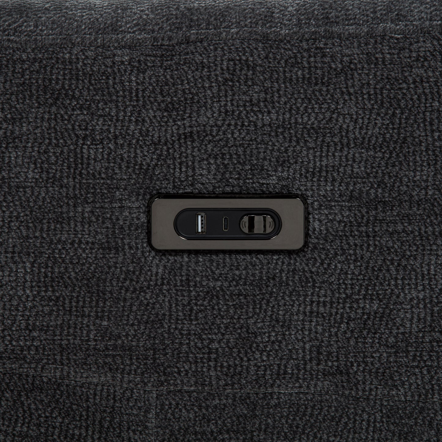 • Dark grey chenille upholstery features a soft feel and refined textured weave