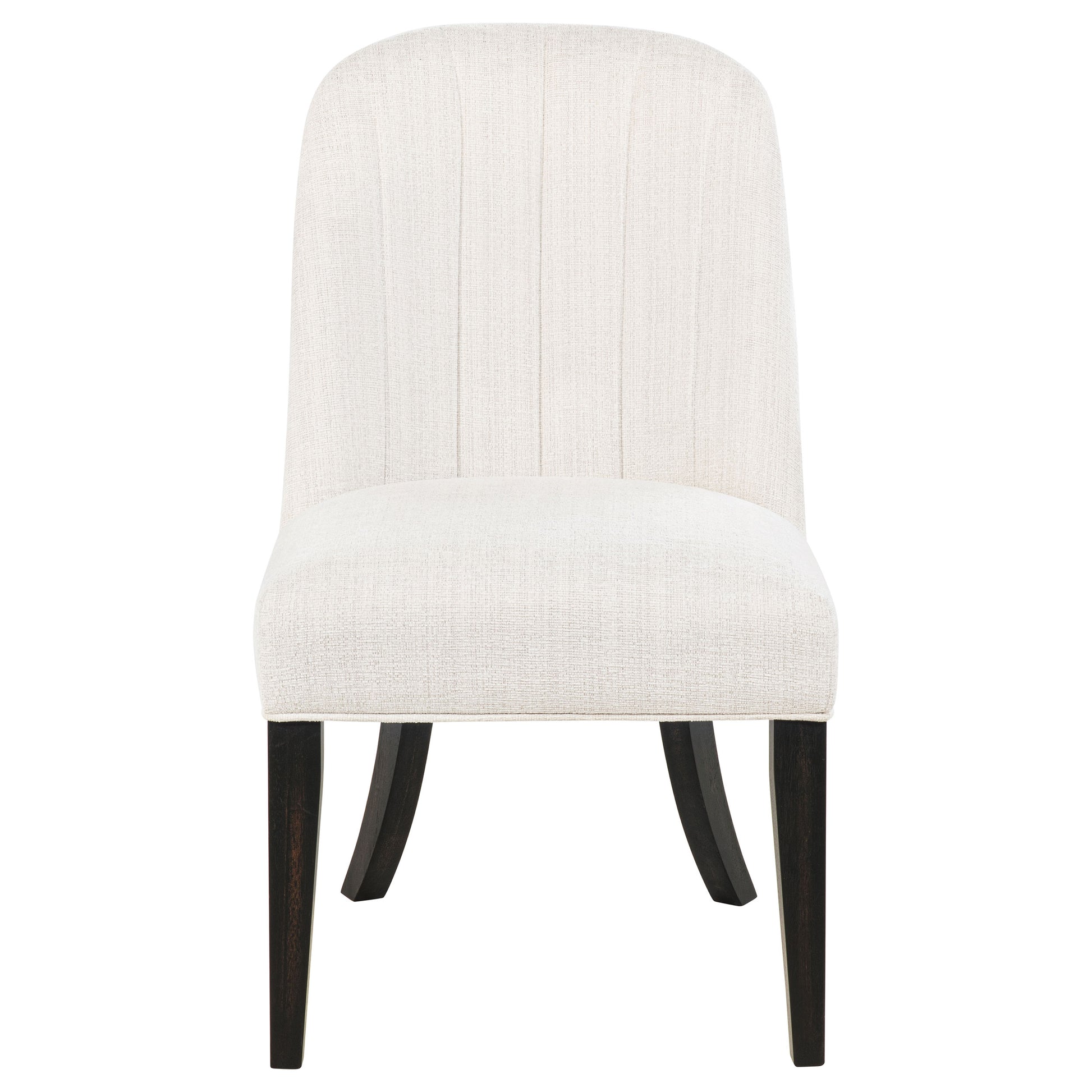 • Dining side chair wrapped in cream fabric with subtle channel tufting along the back