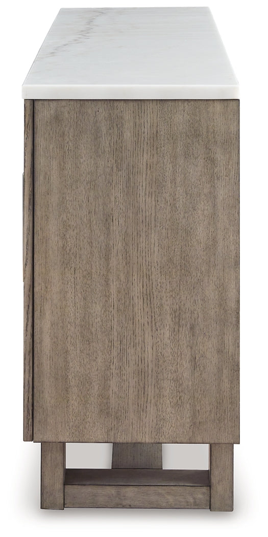 Details | Made with oak veneer and MDF substrate, Grayish brown wood-tone finish, Natural white marble tabletop, Brushed silvertone door pulls, 4 doors with framed chevron accents, 2 cabinets, each with an adjustable shelf, Cutouts for cord management, Accommodates flat-screen TV up to 65", Color variations, fissures, mineral deposits and veining in the marble top are naturally formed characteristics, Assembly required | |