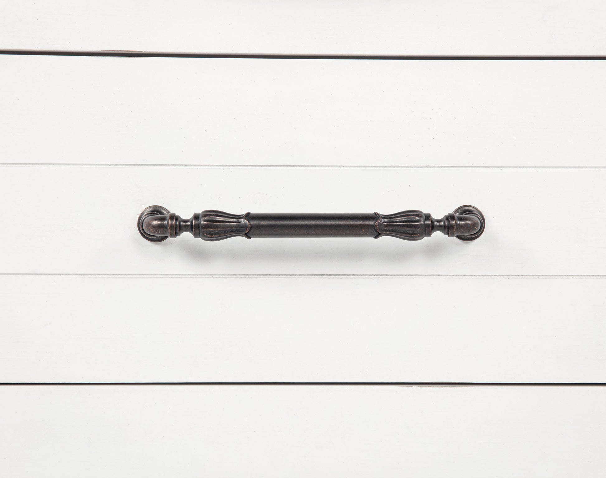 • Antique bronze pulls bring contrast and decorative depth to the frame