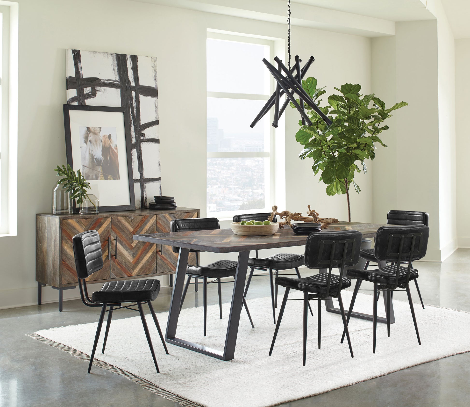 • Retro charm with Mid-Century Modern attitude in a seven-piece casual dining set featuring a rectangular wood and iron dining table with tilted open leg braces and six side chairs with iconic metal framing and channeled tufting upholstery