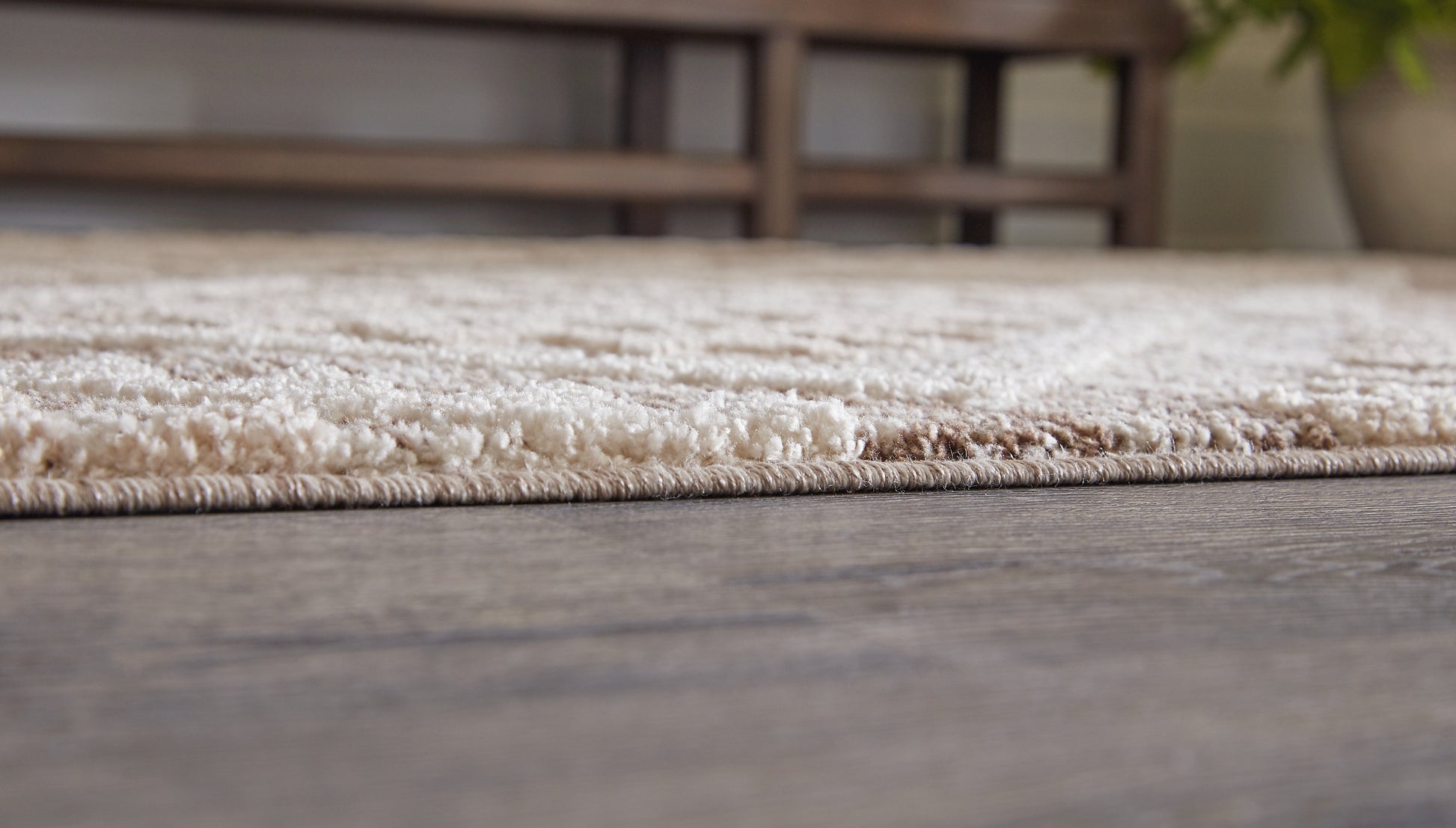 Details Made of polyester shrink yarn/polypropylene frieze blend, Machine woven high-low pile, 10mm pile, Backed with jute, 3" braided tassel edge, Spot clean only, Rug pad recommended, Imported