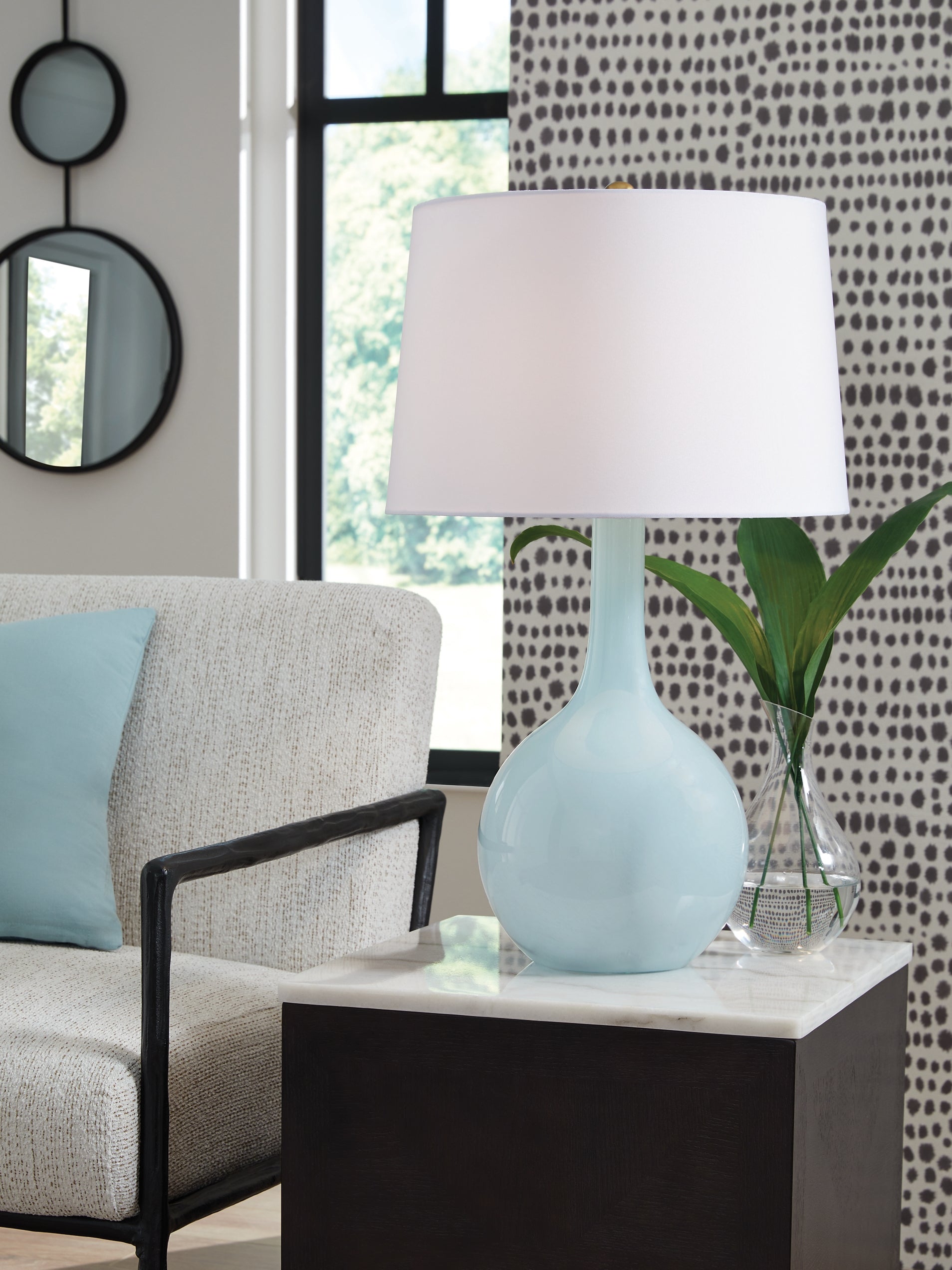 Details | Made of glass with modified drum hardback fabric shade, Aqua finish, 3-way switch, 1 E26 socket, type A bulb recommended (not included); 150 watts max or CFL 25 watts max; UL Listed, Due to the finishing process of this product, some variations may occur, Assembly required | |