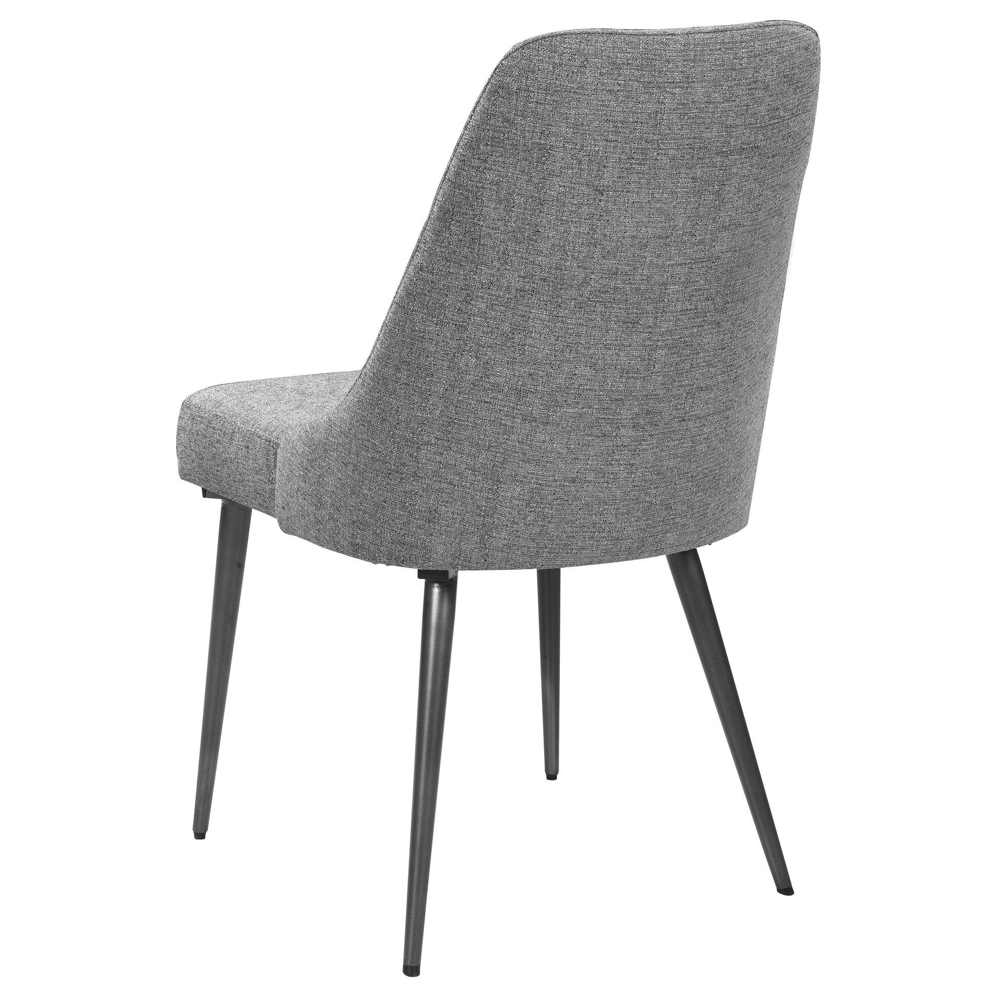• Chairs feature grey textured fabric upholstery and tapered gunmetal legs