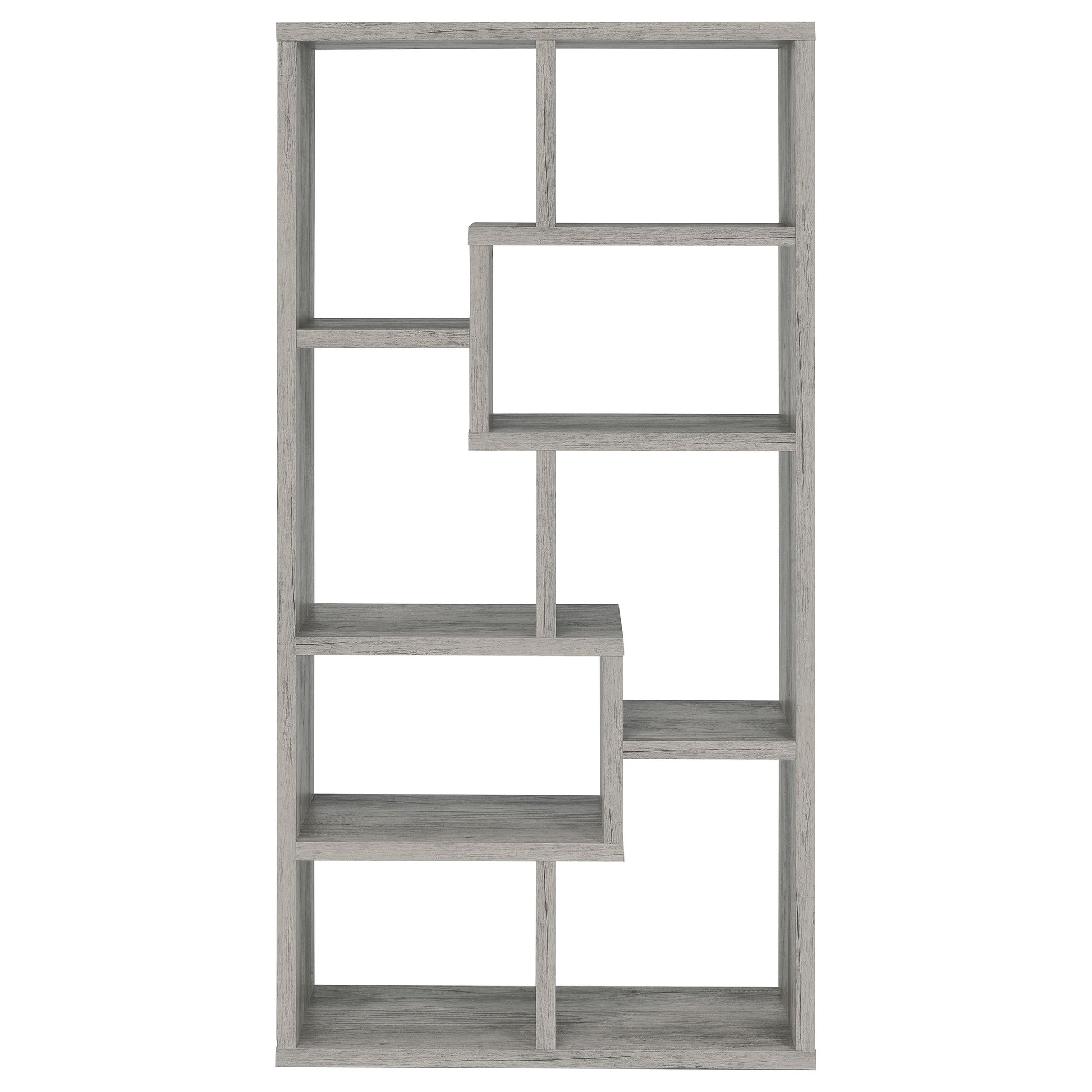 • Geometric bookshelf in grey driftwood with varied open compartments
