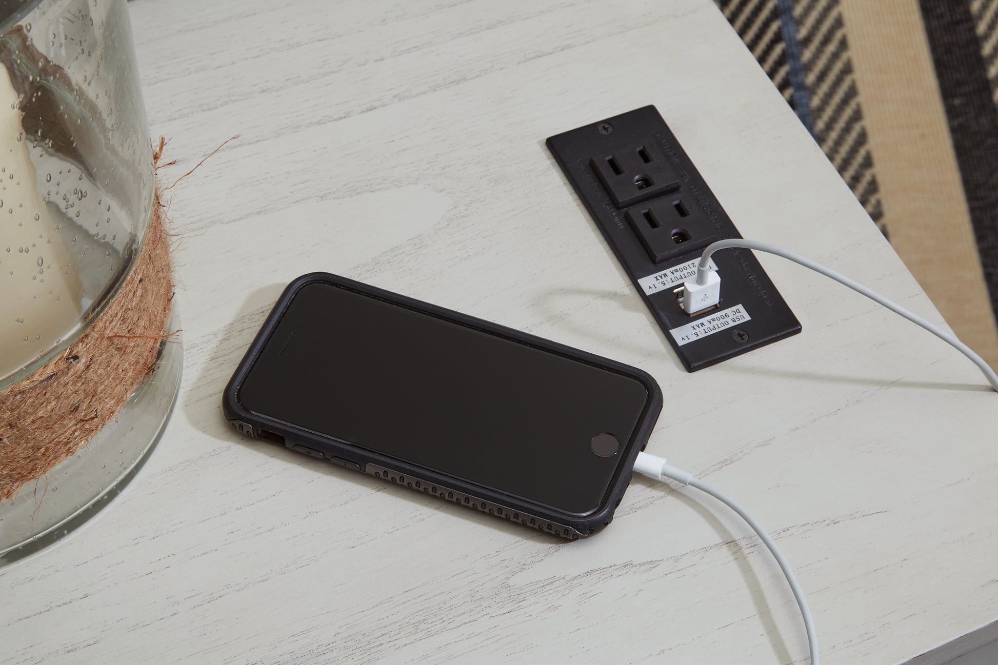Details | Made with solid wood, wood veneer and MDF substrate, Whitewashed wood tone finish, Table features storage cabinet, open cubby shelf and pull-out tray, 110V power supply with dual USB charging ports, Power cord included; UL Listed, Due to the use of natural materials, some variations may occur, Assembly required | |