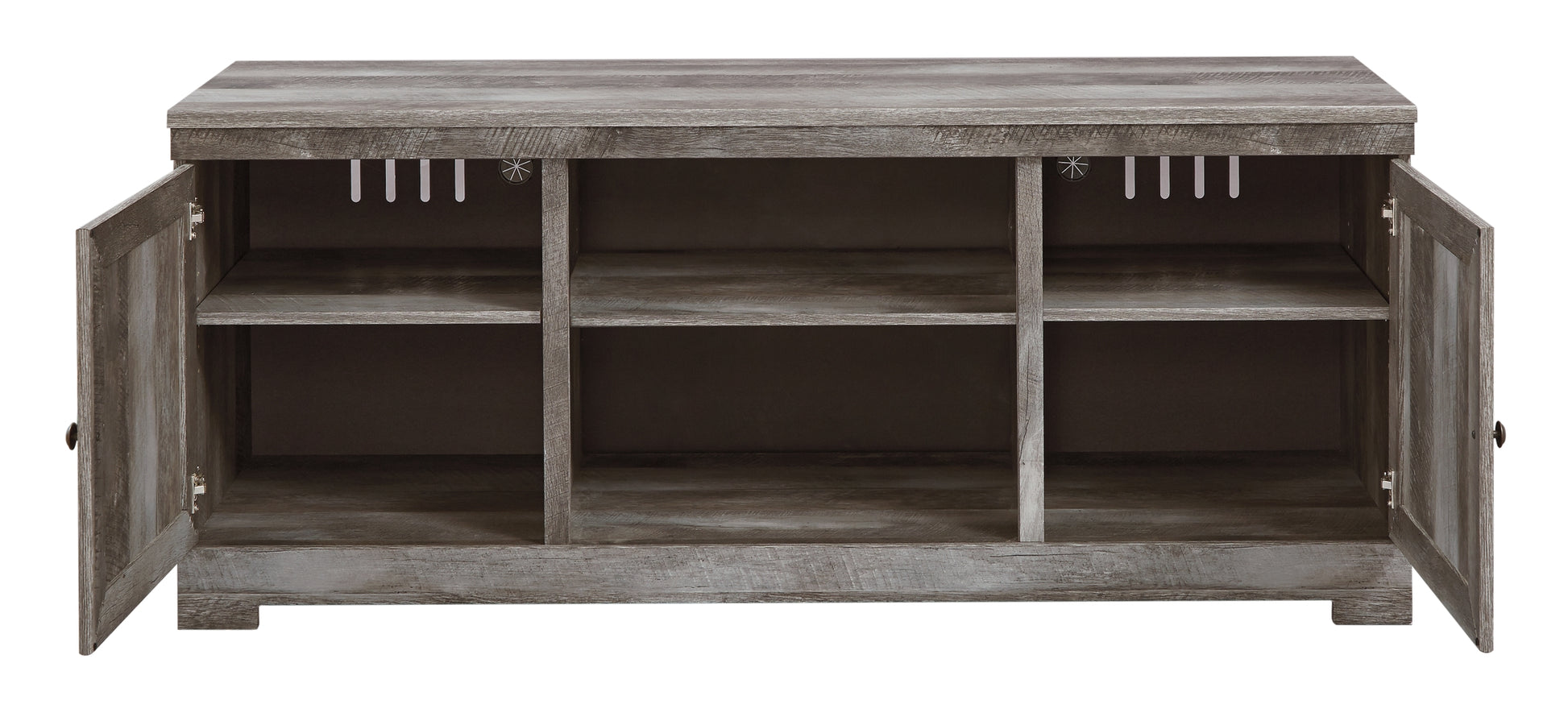 Details | Includes TV stand and electric fireplace insert (W100-02), Made with engineered wood (MDF/particleboard), Rustic gray finish over replicated oak grain, Plank effect, 2 storage cabinets (each with an adjustable shelf), Removable/adjustable center shelf, Cutouts for wire management and ventilation, Electric fireplace insert provides up to 4,608 BTU/1,400W and warms up to 400 square feet (heats a mid-size room) , 6-level temperature setting; 5 levels of flame brightness; overheating control device, LED-lit flame operates with or without heat; option for placing faux glass crystals or stones (included), Remote control with LED display, Power cord included; UL Listed, Assembly required; simply remove the center shelf and back panel to make room for the fireplace insert | |